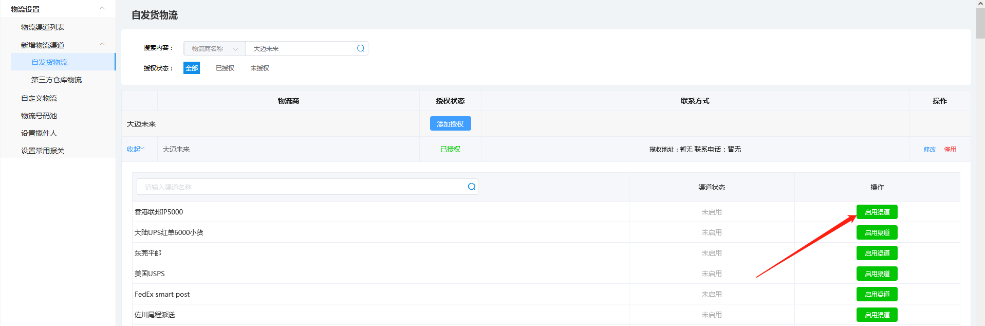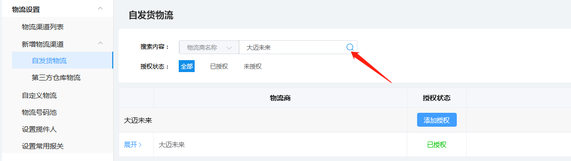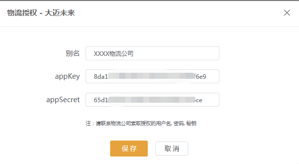 用户端功能说明设置API授权全球交易助手全球交易助手新建,选择授权已有APP,App Id 录入9AZaHR24,点击确定生成API授权码登陆全球交易助手,选择**【物流】---【物流设置】---【新增物流渠道】自发货物流搜索栏录入大迈未来**搜索添加授权,别名自定义, 将系统生成的appKey 和 appSecret 复制到相应框内保存.启用物流渠道