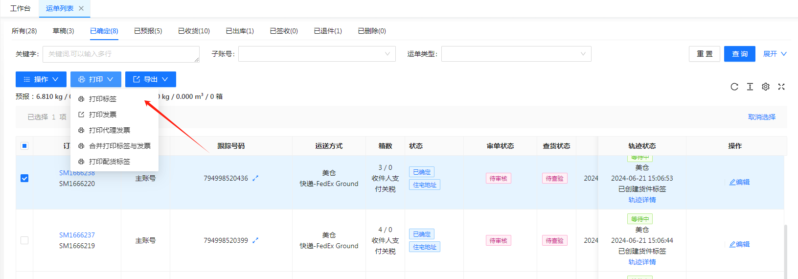 选中运单,点击打印标签,将打印出来的运单标签贴于外包装箱上