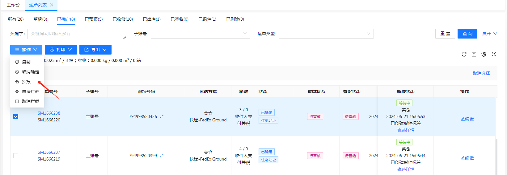 仓库未收货前我们都可以通过取消预报或者取消确定等操作来取消运单,已收货的运单我们可以通过申请拦截来通知仓库对货物进行拦截