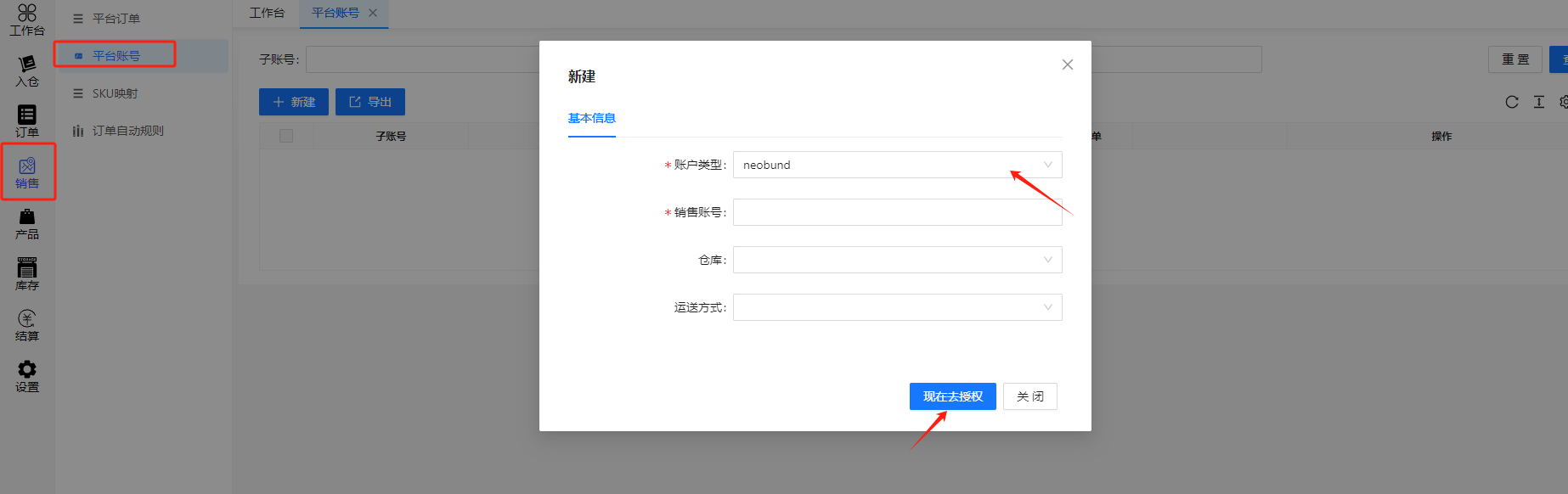在客户端系统,销售 > 平台账号 > 新建