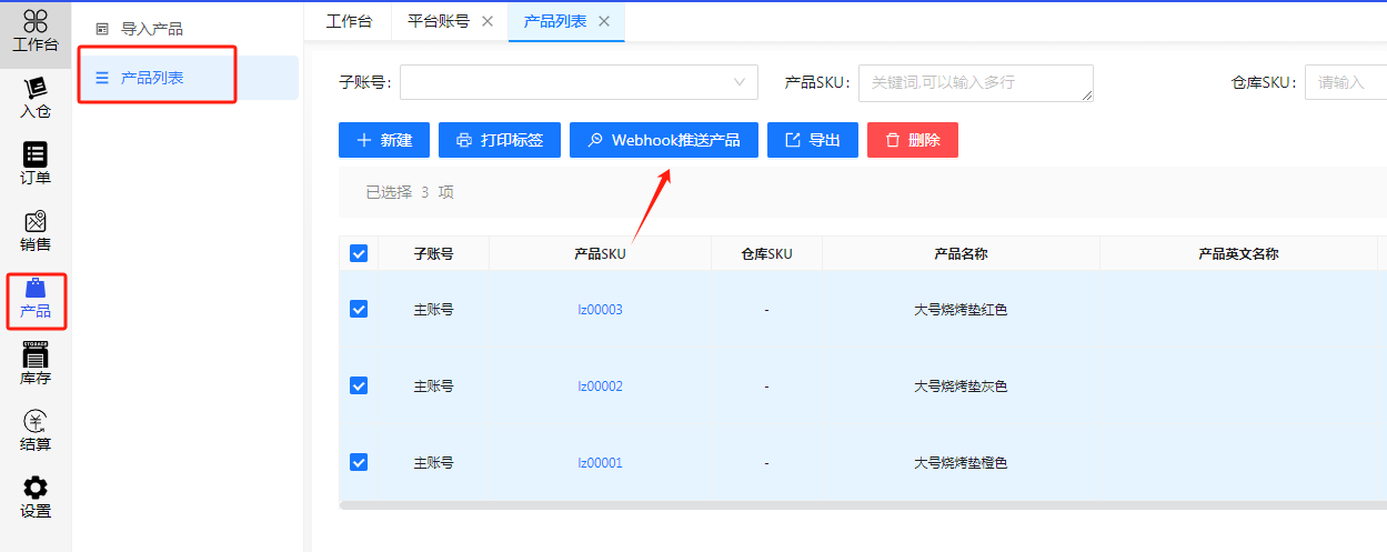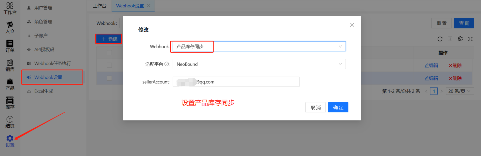 在客户端系统,设置 > webhook设置 > 新建 ,设置产品推送和产品库存同步,绑定账号