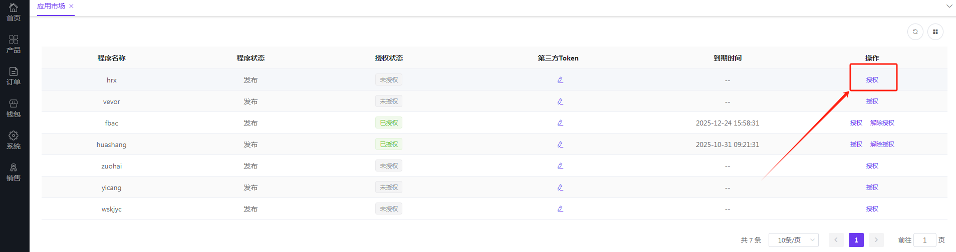 在NB后台 系统>应用市场 找到对应的程序名称, 点击授权