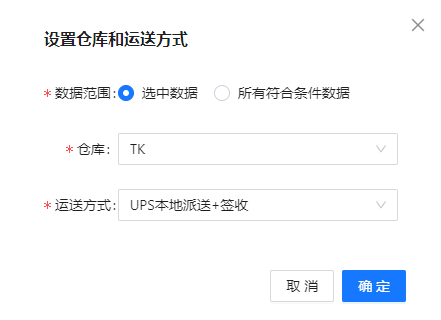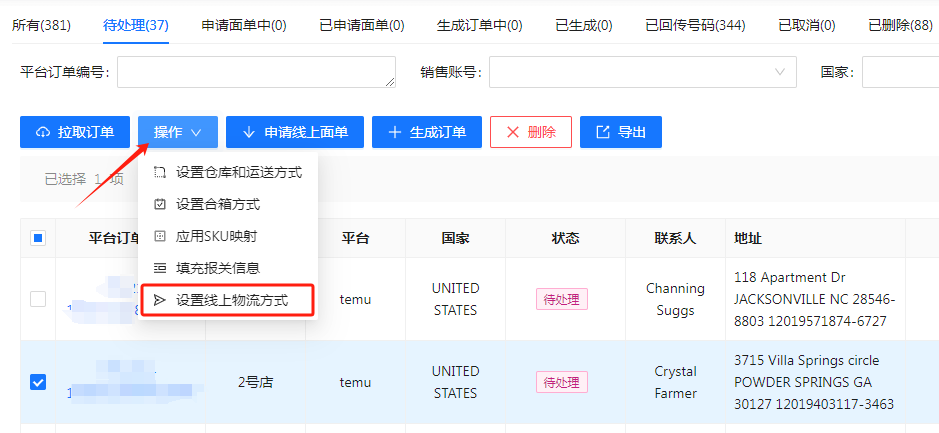 (1)选中订单,点击操作,选择设置仓库和运送方式
