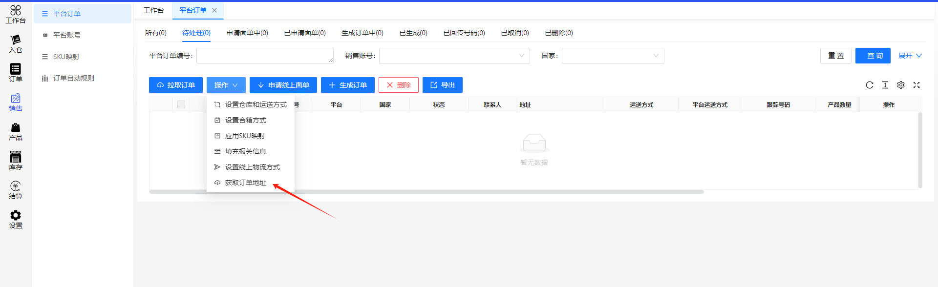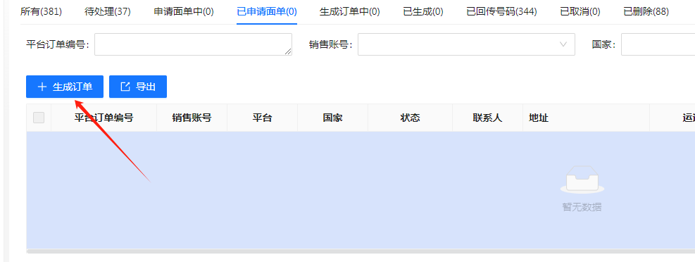 手动生成订单需在已申请 面单中点击生成订单
