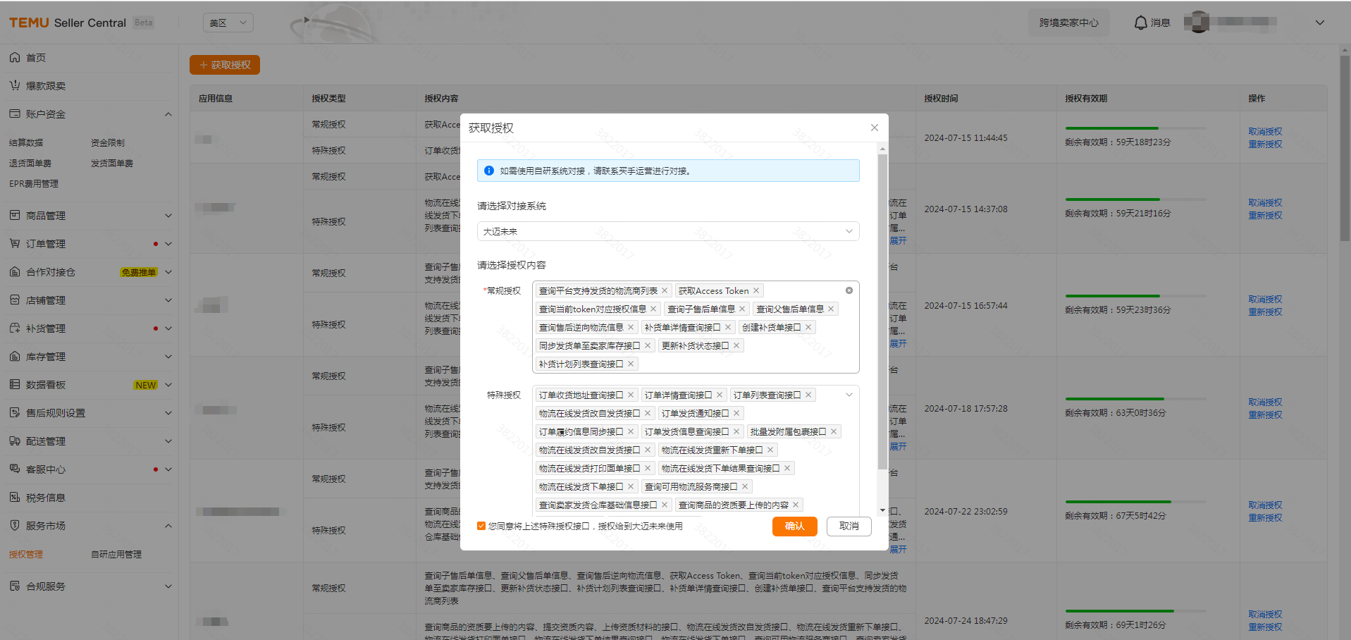 3.选择对接系统为大迈未来, 特殊授权要全部勾选。