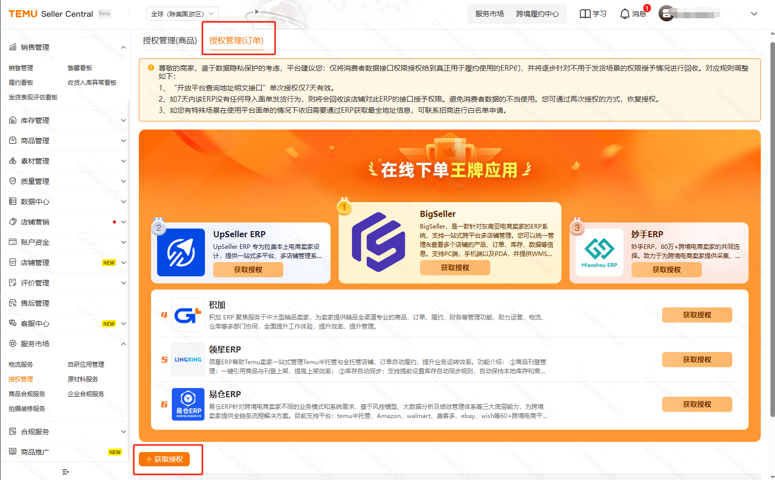 2.左上角选择授权管理订单,点击 获取授权