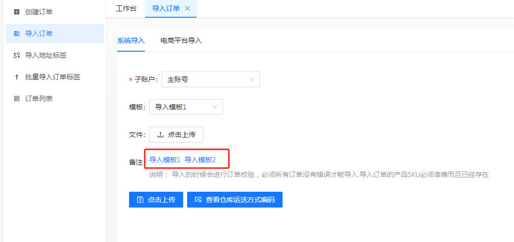 选择导入模板下载(导入模板2适用于产品SKU较多的订单导入)