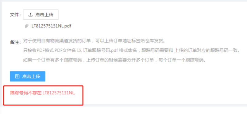 对于使用自有物流渠道发货的订单,需要上传订单地址标签给仓库发货,只接受PDF格式,文件名以 订单跟踪号码.pdf 格式命名。上传订单标签的跟踪号码需与命名的跟踪号码一致,一个订单一个跟踪号码。