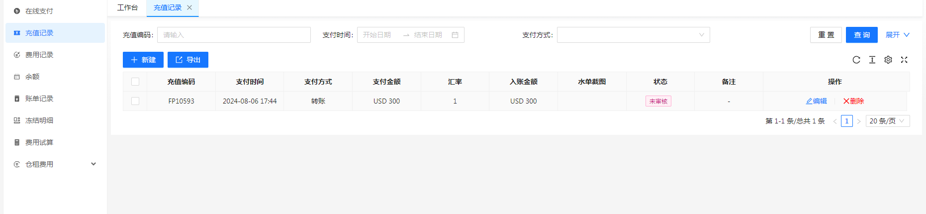 用户端功能说明文档教程结算充值记录充值记录【功能概述】在线充值以及线下充值记录查询。点击新建创建充值记录,客户端创建的充值记录需由管理端进行审核。 点击新建,创建充值记录,输入汇率,点击可进行汇率换算 支持币种转换汇率计算功能 保存后充值记录需由管理端审核